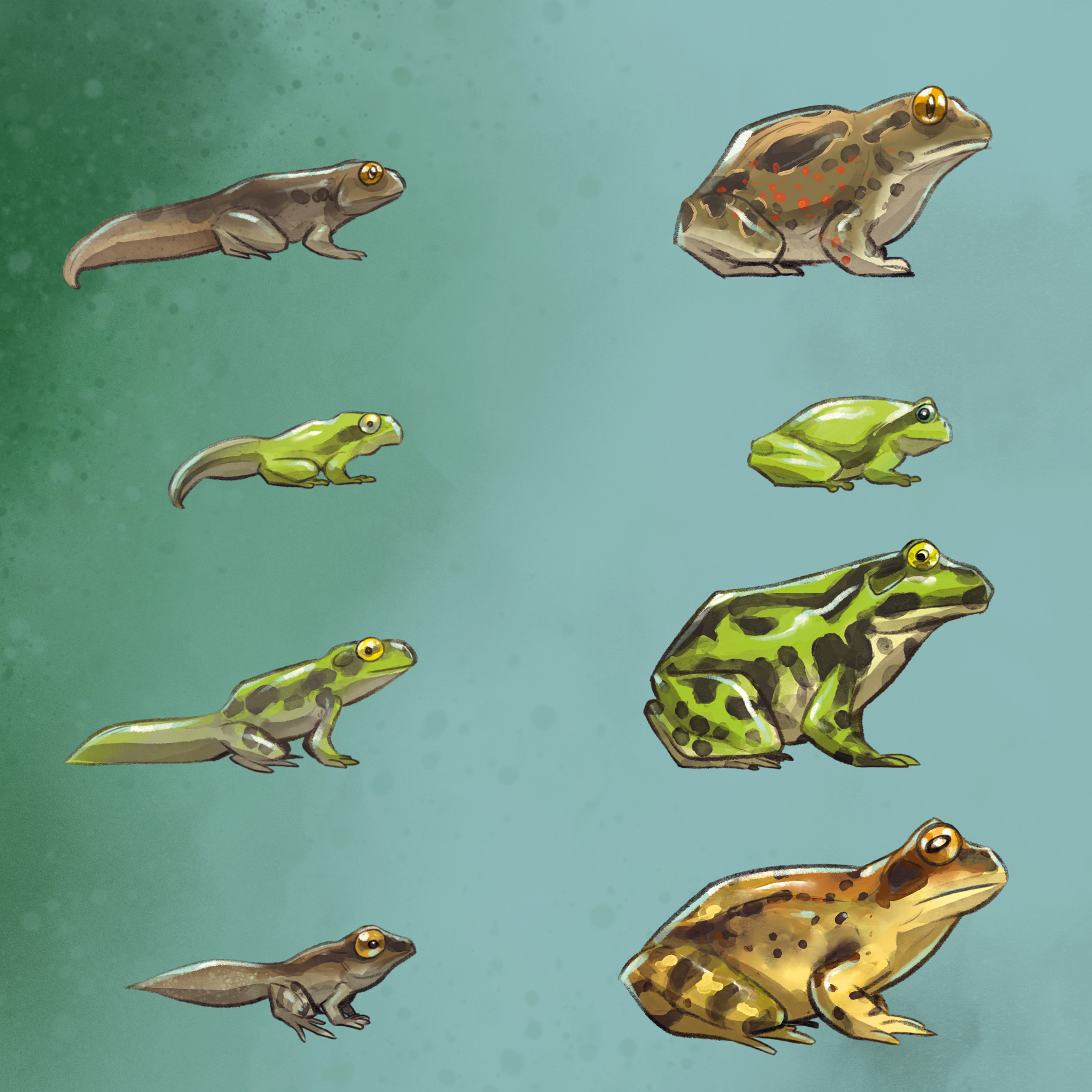 Es gibt verschiedene Amphibienarten, die ganz unterschiedlich aussehen können. Manche Arten haben Warzen auf der Haut, andere haben glatte Haut. Manche haben Schwimmhäute zwischen den Zehen, andere haben Saugnäpfe an den Zehenspitzen, mit denen sie auch Bäume hochklettern können (Laubfrosch), andere sind bunt gefärbt. Die Männchen des Moorfroschs können beispielsweise ihre Farbe ändern und färben sich während der Paarungszeit blau.