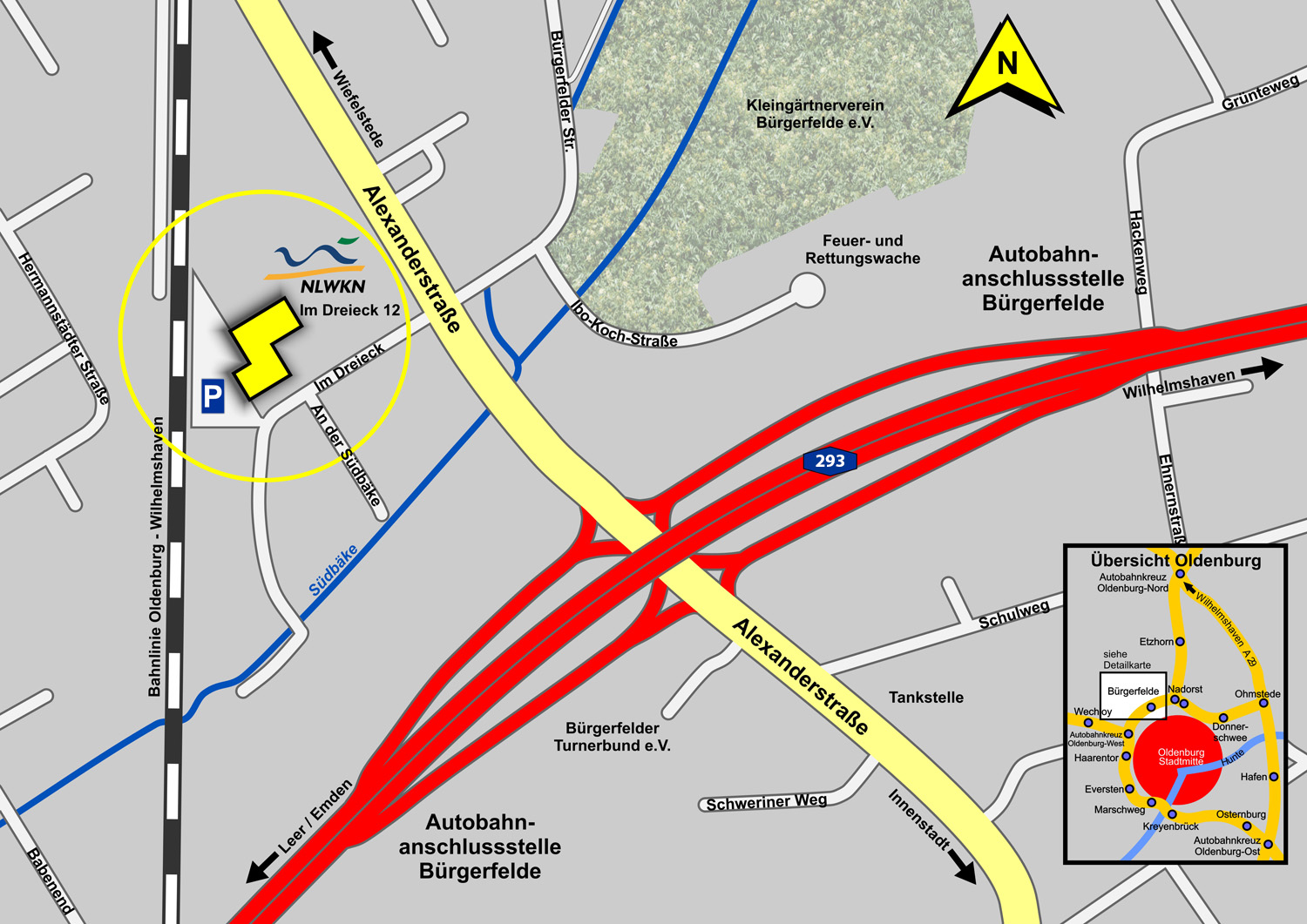 Fahren Sie auf die Autobahn (A31) Richtung Oberhausen/Leer. Am Autobahndreieck Leer (9) links halten und weiter fahren auf der Autobahn (A28) Richtung Oldenburg. Am Autobahndreieck Oldenburg-West biegen Sie nach links ab auf die Autobahn Richtung Wilhelmshaven/Brake (A 293). An der Ausfahrt Oldenburg-Bürgerfelde (Ausfahrt 10) verlassen Sie die Autobahn und biegen links ab auf die Alexanderstraße Richtung Wiefelstede. Nach wenigen hundert Metern erneut links in die Straße "Im Dreieck" abbiegen. Das Dienstgebäude mit der Hausnummer 12 befindet sich auf der rechten Seite. Ein Parkplatz liegt unmittelbar hinter dem Gebäude.