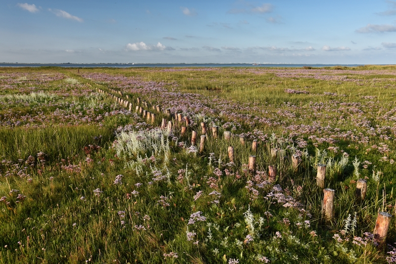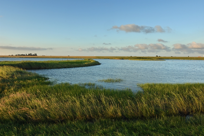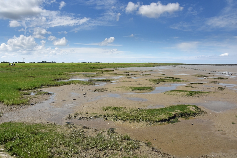 Auf der Landseite der Inseln und an der Festlandsküste werden die Wattflächen meist von Salzwiesen abgelöst. Besonders auf den Inseln finden sich naturnahe Ausprägungen der Salzwiesen, die von zahlreichen, unregelmäßig mäandrierenden Prielen durchzogen sind. Ein typischer Brutvogel dieses Lebensraumes ist der Säbelschnäbler, der zur Nahrungssuche mit pendelndem Kopf durch flache Wasserflächen und Schlickwatten schreitet und dabei mit dem nach oben gebogenen Schnabel kleine Tiere keschert.