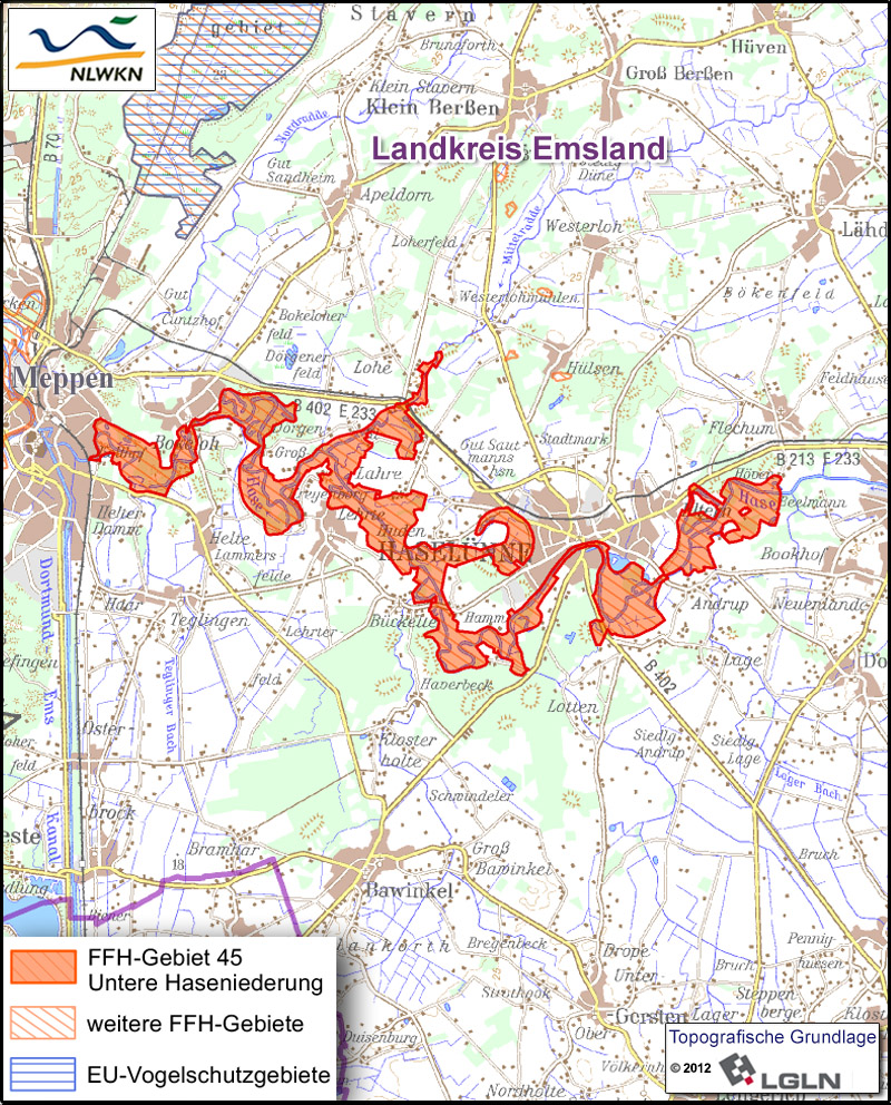 Das FFH-Gebiet „Untere Haseniederung“ umfasst den Unterlauf der Hase zwischen Herzlake im Osten und Meppen im Westen. Die Hase entspringt im Teutoburger Wald, durchfließt zunächst in nordwestlicher Richtung das Osnabrücker Berg- und Hügelland und das sich zwischen den Endmoränenzügen Ankumer Höhe und Dammer Berge erstreckende Artland, spaltet sich bei Quakenbrück in einem sogenannten Binnendelta kurzzeitig in die Kleine und die Große Hase auf, die hier ihre Fließrichtung nach Westen ausrichten. Nach Passieren der Ortschaften Löningen, Herzlake und Haselünne mündet die Hase in Meppen in die Ems.