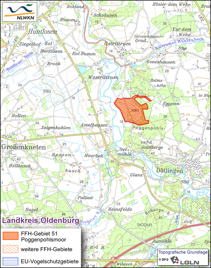 Das FFH-Gebiet „Poggenpohlsmoor“ liegt nordwestlich von Wildeshausen im Naturraum Delmenhorster Geest und wird durch seine Lage am Rand der Hunteniederung geprägt. Gespeist von unter anderem Sickerwasser aus der östlichen, höhergelegenen Geest konnte sich hier ein kleines, aber wertvolles Übergangsmoor entwickeln.