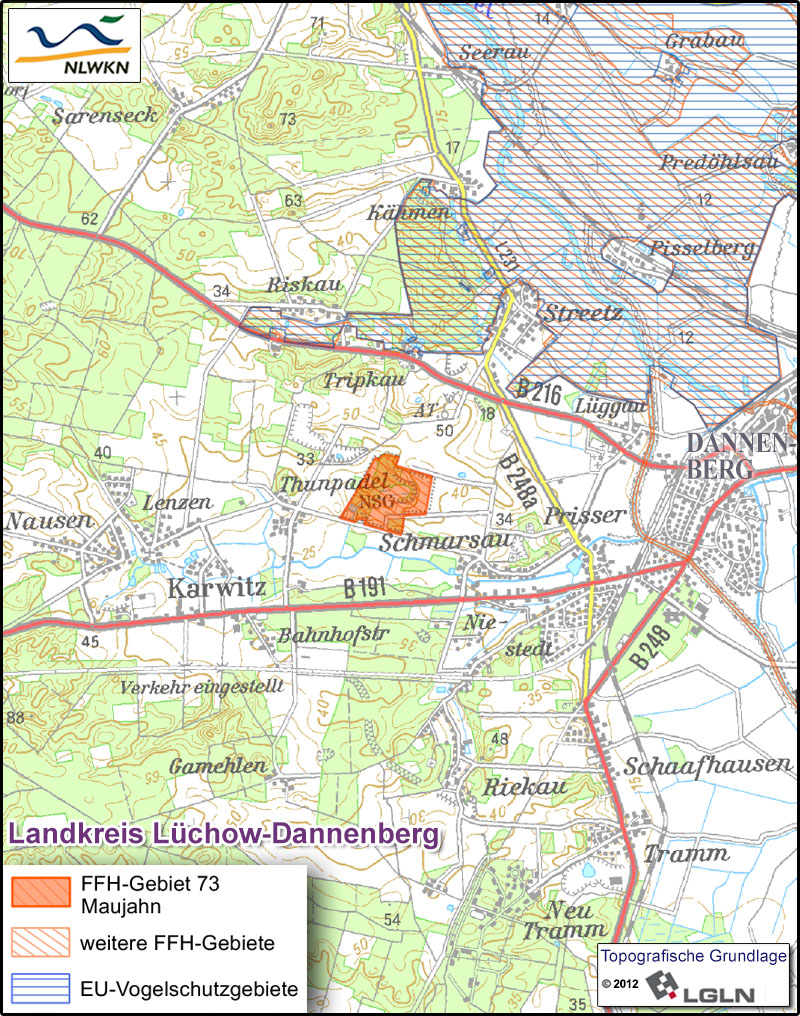Das FFH-Gebiet „Maujahn“ liegt westlich von Dannenberg am östlichen Rand des Drawehn, einer Endmoräne, die durch die Gletscher der Saale-Kaltzeit geformt wurde. Östlich grenzt das Urstromtal der Elbe an die Geest – der Übergang ist teilweise durch markante Steilhänge gekennzeichnet. Auch im Gebiet findet sich ein eindrückliches Relief, welches aber auf die Auslaugung eines Salzstockes im Untergrund zurückzuführen ist: In dem nahezu kreisförmigen Erdfall ist heute ein Kesselmoor ausgebildet, welches von mit Laubwäldern bestandenen Hängen umgeben ist.