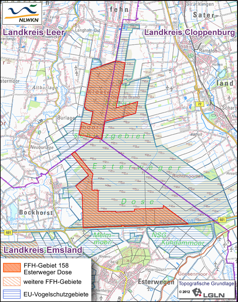 Das FFH-Gebiet „Esterweger Dose“ besteht aus zwei Teilgebieten innerhalb des gleichnamigen stark degradierten Hochmoors in der Hunte-Leda-Moorniederung östlich von Papenburg. Das Hochmoor bildete in seiner ursprünglichen Ausdehnung noch Mitte des vergangenen Jahrhunderts das größte zusammenhängende Regenmoorgebiet Mitteleuropas mit Torfmächtigkeiten von bis zu 13 Metern. Ab 1959 wurde das Gebiet entwässert und durch industriellen Torfabbau zunehmend beeinträchtigt. Während außerhalb des FFH-Gebietes auch heute noch großflächig Torf abgebaut wird, liegen innerhalb der Schutzgebietsgrenzen renaturierte, mittlerweile aus der Nutzung genommene und wiedervernässte Flächen. Südwestlich der Esterweger Dose liegt das ebenfalls zum ehemaligen Hochmoorkomplex gehörende FFH-Gebiet 159 „Leegmoor“.