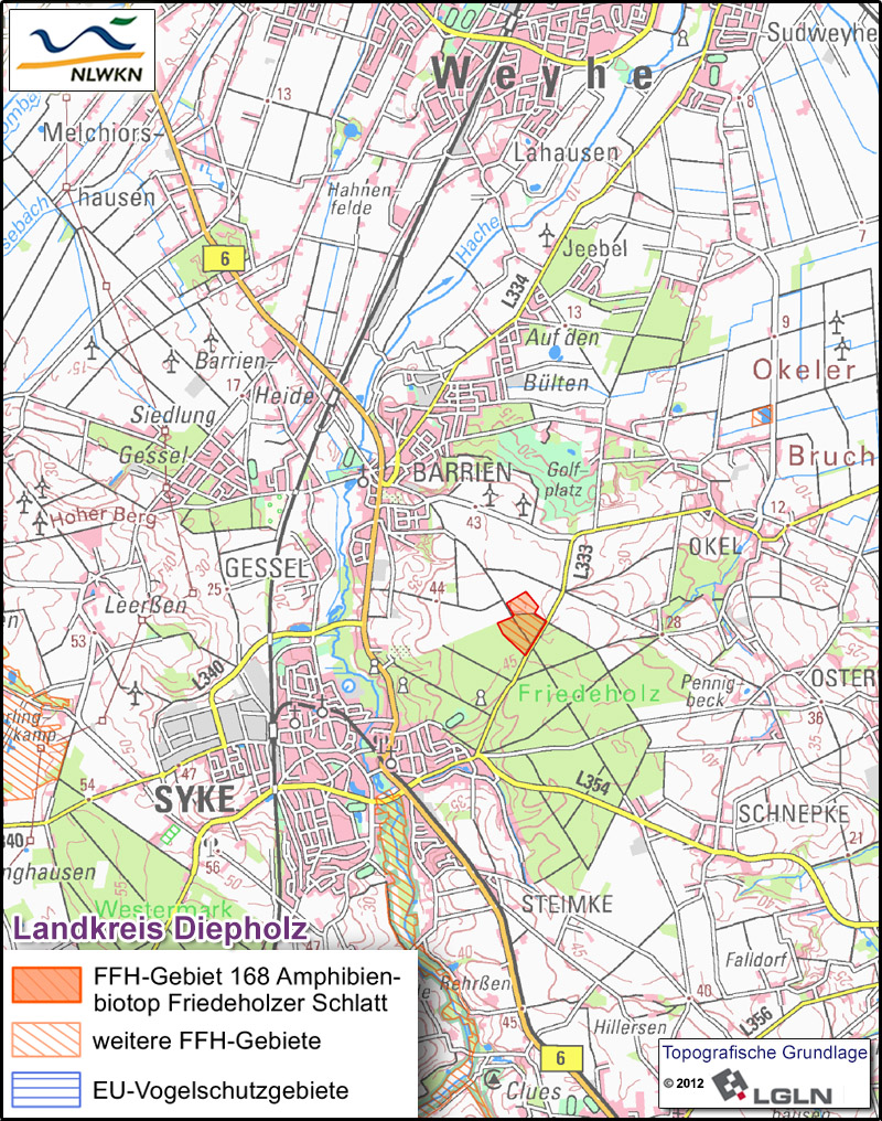 Das FFH-Gebiet „Amphibienbiotop Friedeholzer Schlatt“ liegt nordöstlich von Syke im Naturraum Syker Geest und ist durch seine Stillgewässer, die in eine Grünfläche eingebettet sind, insbesondere als Lebensraum verschiedener Amphibienarten von Bedeutung. So kommen im Friedeholzer Schlatt unter anderem die streng geschützten Arten Kammmolch und Laubfrosch vor. Zum Gebiet gehört auch ein Teil des südlich angrenzenden Walds, welcher dem Kammmolch aufgrund des Strukturreichtums geeignete Winterlebensräume bietet.