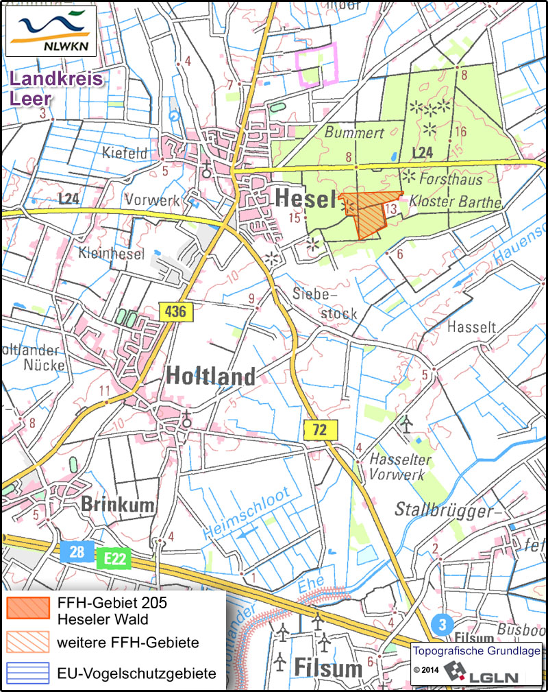 Das FFH-Gebiet „Heseler Wald“ nordöstlich von Leer liegt im Naturraum Ostfriesische Geest. Auf den trockenen bis frischen, nur mäßig mineralstoffreichen Sandböden wachsen Hainsimsen-Buchenwälder mit Beimischungen von Stieleichen.