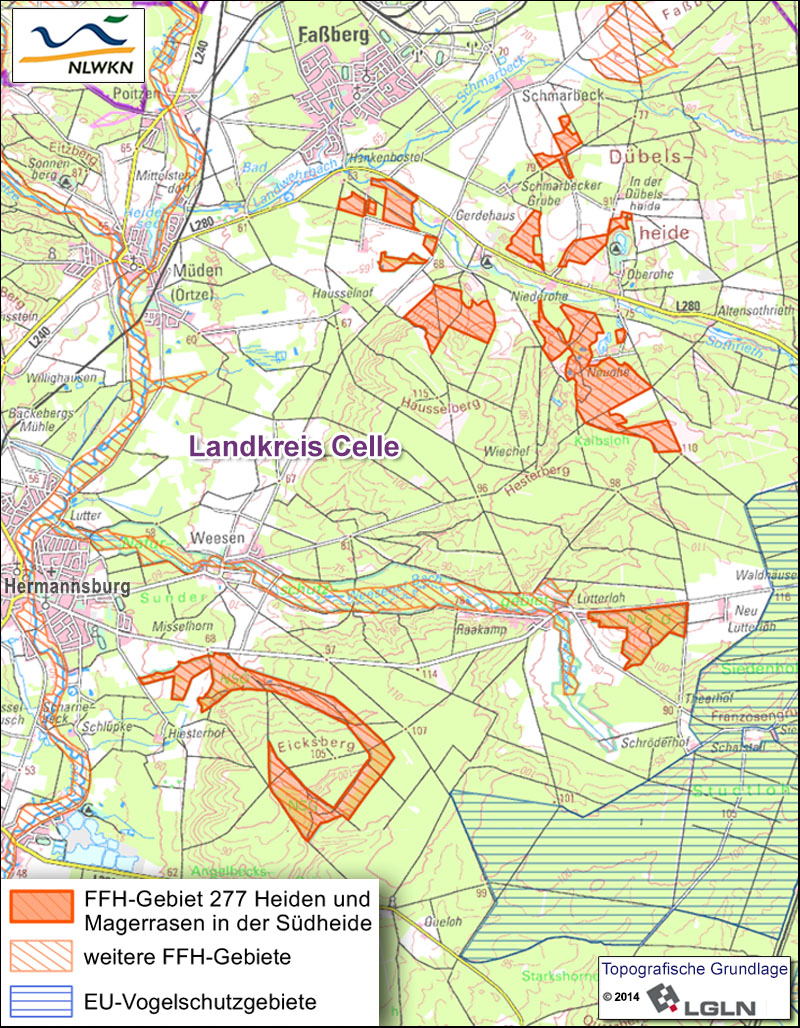 Kleinflächig kommen an der Sothrieth östlich von Faßberg, östlich von Hermannsburg sowie in einer anmoorigen Senke mit Beständen aus Erlen und Eschen, feuchten Heiden, Übergangs- und Schwingrasenmooren und Torfmoor-Schlenken auch Lebensräume feuchter bis nasser Standorte vor. Durch den früheren Abbau von Kieselgur nahe der Ortschaft Oberohe wurden außerdem mehrere kleine Stillgewässer geschaffen, von welchen eines dem Lebensraumtyp der nur mäßig nährstoffreichen Stillgewässer mit Strandlings- oder Zwergbinsenvegetation entspricht.Zudem liegt das FFH-Gebiet in der Kulisse des IP-LIFE - Projektes "Atlantische Sandlandschaften".