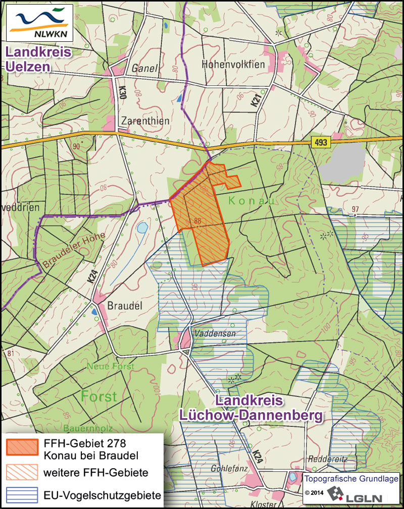 Das FFH-Gebiet „Konau bei Braudel“ liegt westlich von Waddeweitz im Naturraum Ostheide und umfasst insbesondere bodensaure Eichenwälder auf dem flachwelligen Hochplateau des Drawehn. Als Teil der Osthannoverschen Endmoräne, die durch die Gletscher der Saale-Kaltzeit geformt wurde, wird das Gebiet insbesondere von nährstoffarmen, lehmigen bis sandigen Böden geprägt.
