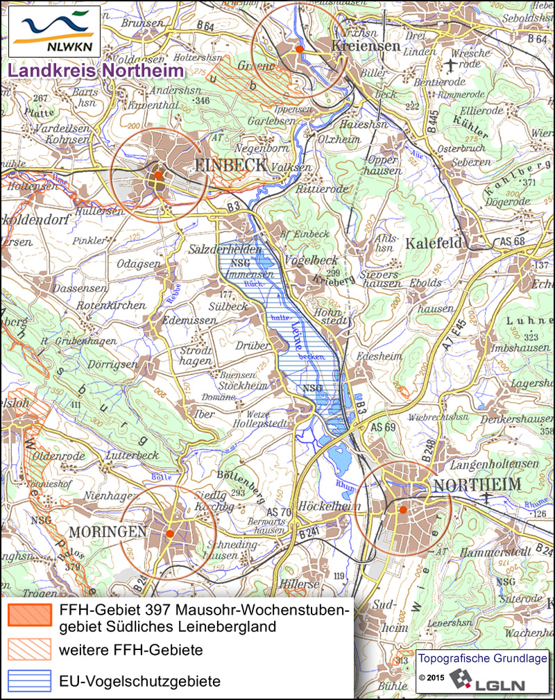 Das FFH-Gebiet „Mausohr-Wochenstubengebiet Südliches Leinebergland“ umfasst mit den Dachböden zweier Kirchen, eines Rathauses und eines Heimatmuseums in den Ortschaften Greene, Moringen, Einbeck und Northeim vier derzeit genutzte oder potentielle Sommer- und Wochenstubenquartiere der streng geschützten Fledermausart Großes Mausohr. Die Gebäude teilen sich auf die beiden Naturräume Leine-Ilme-Senke und Südwestliches Harzvorland auf.