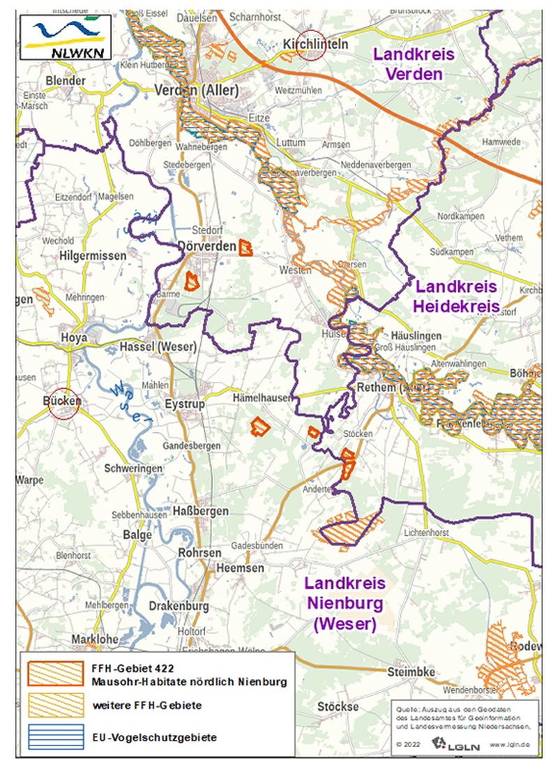 Das FFH-Gebiet „Mausohr-Habitate nördlich Nienburg“ umfasst in mehreren räumlich voneinander getrennten Teilgebieten zwei Wochenstubenquartiere sowie nahegelegene Jagdhabitate des streng geschützten Großen Mausohrs zwischen Verden im Norden und Nienburg im Süden.
