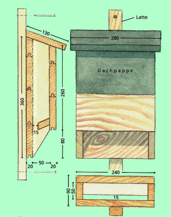 Um den Ansprüchen möglichst vieler Fledermausarten gerecht zu werden, ist es sinnvoll, verschiedene Kastentypen aufzuhängen: sogenannte Flachkästen für Spalten bewohnende Arten und Kästen mit größerem Hohlraum für Höhlen bewohnende Arten. Beide Kastentypen werden von verschiedenen Herstellern im Handel angeboten. Fledermauskästen aus Holz können mithilfe der untenstehenden Anleitung selbst angefertigt werden. Einfach selbst zu bauen sind auch sogenannte Fledermausbretter, die etwa dem abgebildeten Fledermauskasten entsprechen. Im Unterschied zu diesem sollten Fledermausbretter aber mindestens doppelt so breit sein, unten keine Querlatte haben und einen engeren Innenraum von nur 2 cm unten. Das beim Bau von Fledermauskästen und Fledermausbrettern verwendete Holz sollte mindestens 20 mm stark und an der Innenseite möglichst rau sein.