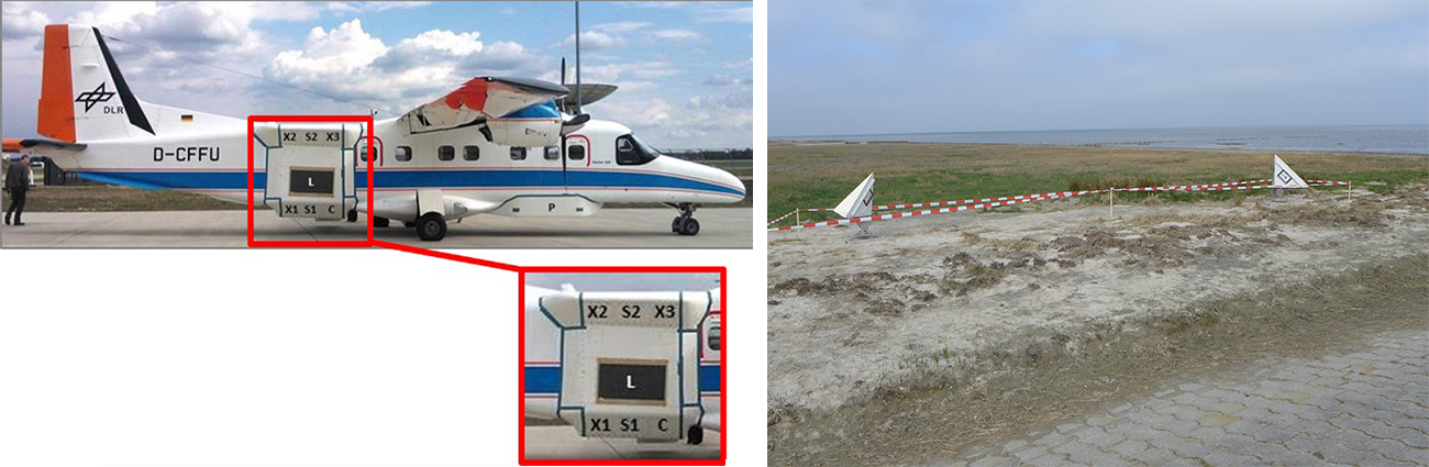 Abb. 3: Die Befliegungskampagnen. Das für die drei Befliegungskampagnen genutzte Forschungsflugzeug des DLR mit F-SAR Sensor. Dieser Sensor ermöglicht die simultane Aufzeichnung in bis zu 4 Frequenzbändern. Für das Projekt relevant sind das X-Band (hohe Auflösung) und das S-Band (Vegetationseindringung) (links, Quelle: GeoWAM-Projektwebsite).
