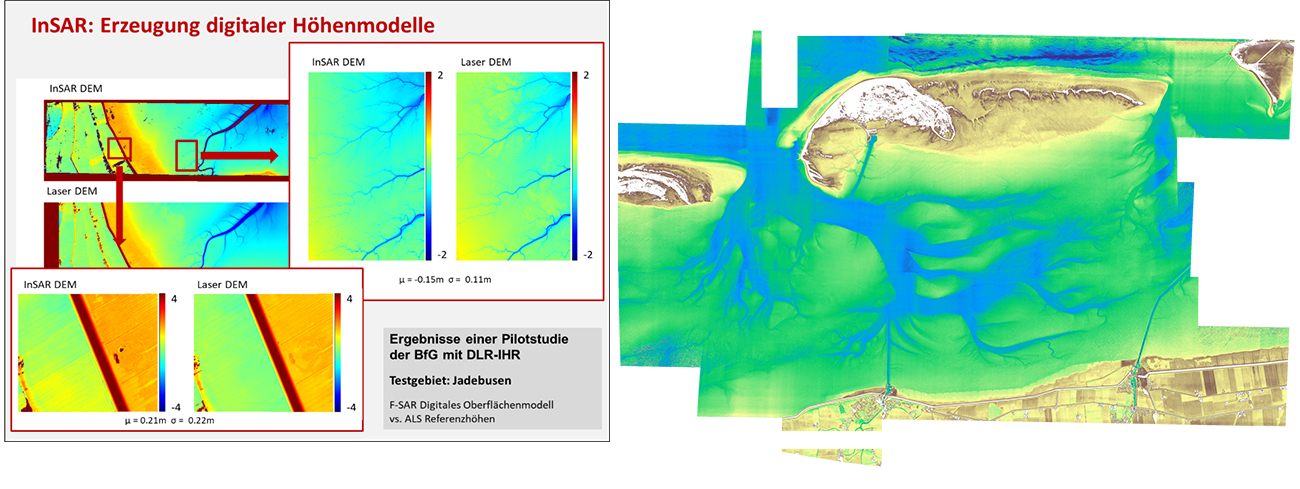 Abb. 4: Erste Ergebnisse. Ein Vergleich der in der Vorstudie (2014) erzeugten Höhenmodelle, welche auf der Geodatenerfassung mit Hilfe der InSAR- bzw. ALS-Technik basieren (links, Quelle: GeoWAM-Projektantrag im Rahmen der BMVI-Förderrichtlinie „Modernitätsfonds“).