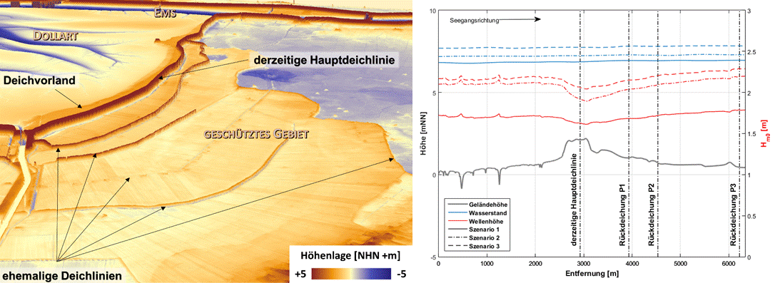 Der Forschungsschwerpunkt bei der Forschungsstelle Küste lag dabei auf Teilprojekt 3 „Belastungen von Küstenschutzwerken bei Klimaänderungen und alternative Strategien im Insel- und Küstenschutz“. Hier wurden exemplarisch für die niedersächsische Niederungsküste im Bereich der Rheider Deichacht Alternativen im Vergleich zum derzeit praktizierten Küstenschutz untersucht.