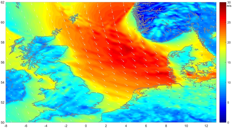 Vom DWD nachgerechnetes Windfeld über der Nordsee zum Zeitpunkt des Sturmflutscheitels bei Norderney im Februar 1962 (COSMO-Modell ohne Nudging für den 16.02.1962 20:00 UTC)