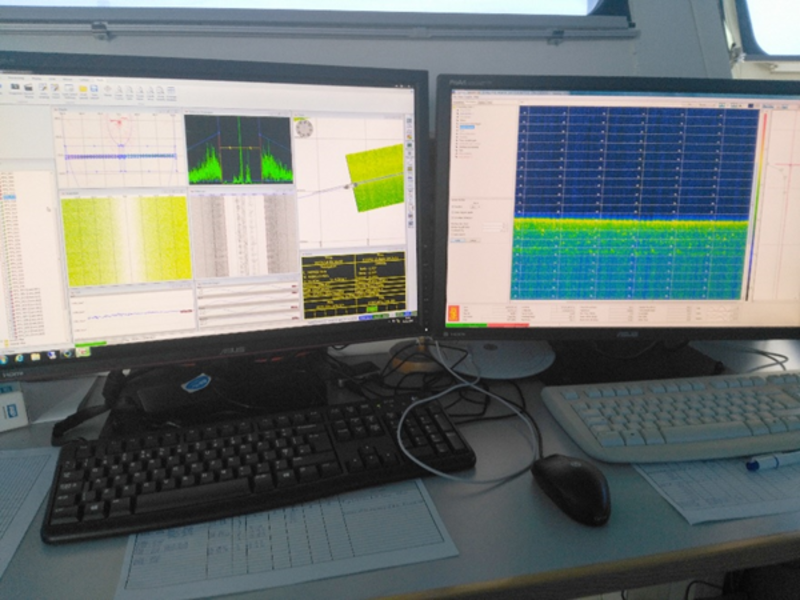 Aufnahmesoftware auf dem NLWKN-Forschungsschiff Burchana zur gleichzeitigen Erfassung von Bathymetrie und Rückstreuintensität (linker Bildschirm) sowie der Sedimentschichtungen des Meeresbodenuntergrundes (rechter Bildschirm).