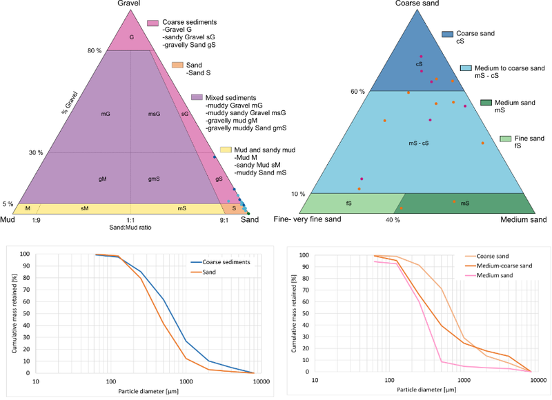 Klassifizierung von Sedimentproben im Messgebiet Borkumriff (Nordsee) nach Folk (1954, links) und Figge (1981, rechts) und Darstellung der Sieblinien der entsprechenden Klassen (unten).
