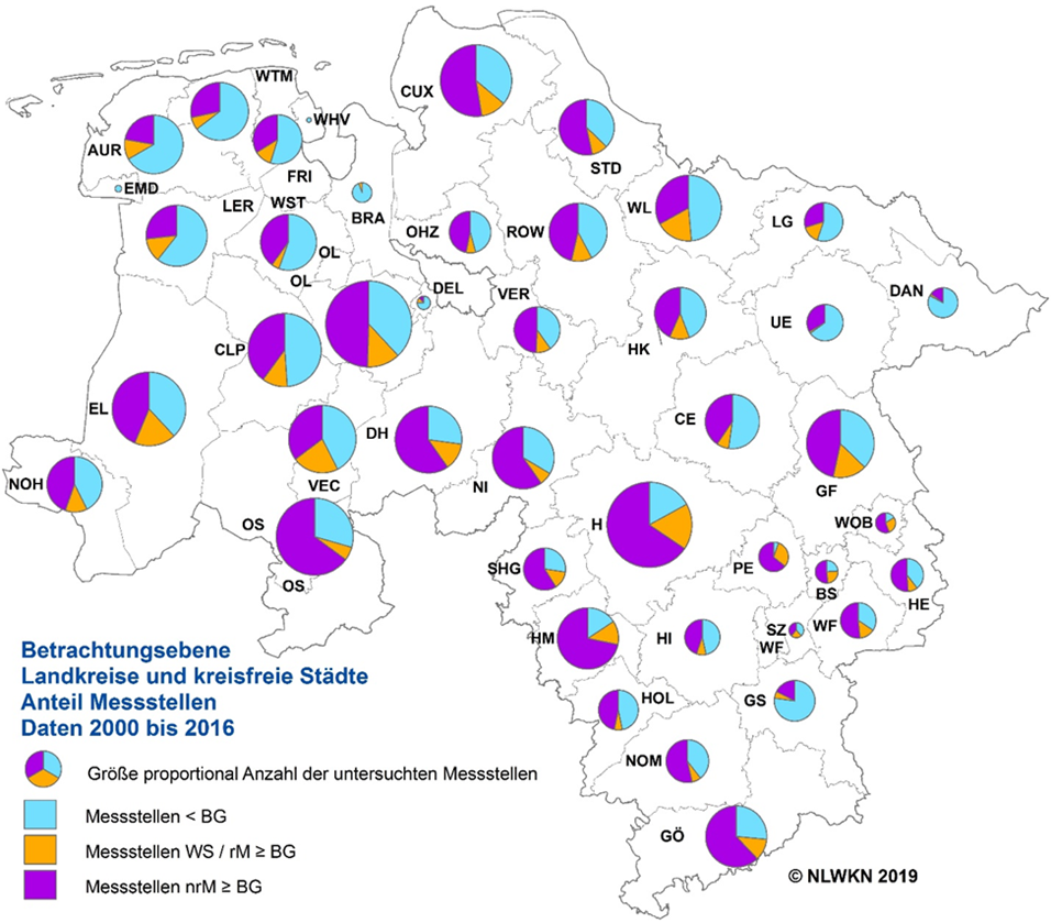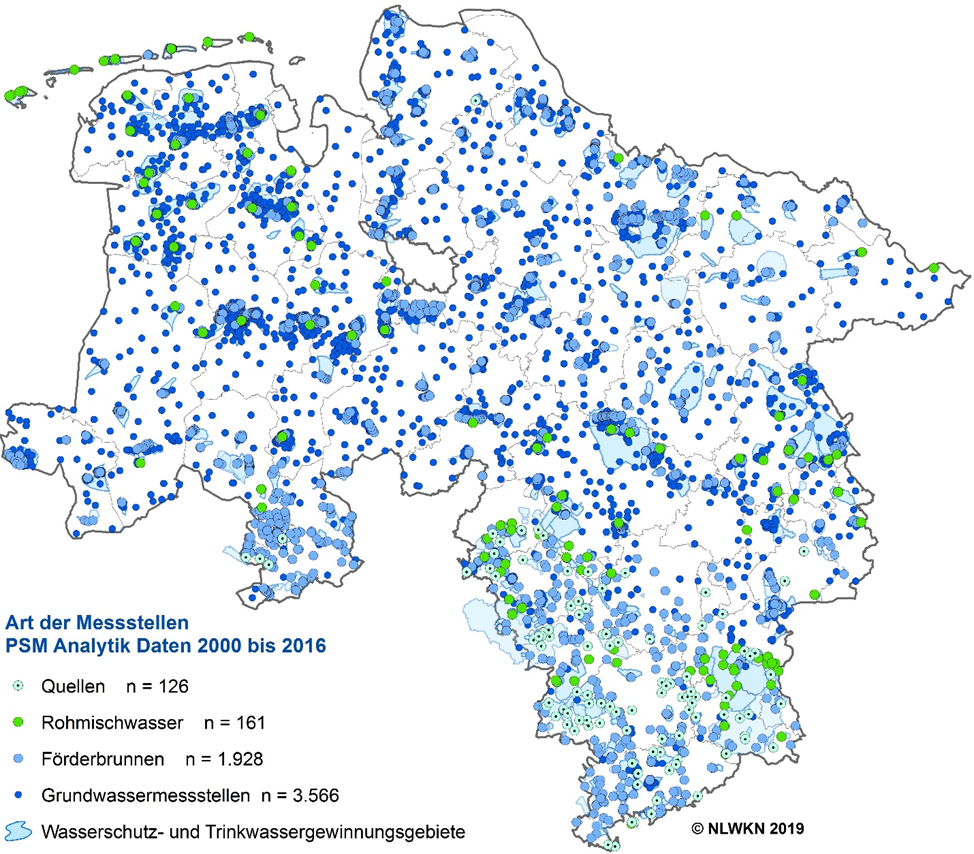 Die Analysen von fast 6.000 Messstellen in den Jahren zwischen 2000 und 2016 bilden die Basis einer umfangreichen Auswertung über Nachweise von Pflanzenschutzmittel-Wirkstoffen (PSM) und deren Abbauprodukten, sogenannten Metaboliten, im Grundwasser Niedersachsens. Die nun vom NLWKN (Niedersächsischer Landesbetrieb für Wasserwirtschaft, Küsten- und Naturschutz) vorgestellten Daten stammen aus Untersuchungen an 1.179 landeseigenen Grundwassermessstellen und wurden ganz wesentlich durch 4.602 Messstellen aller Wasserversorgungsunternehmen Niedersachsens ergänzt. Neben klassischen Grundwassermessstellen fanden auch Untersuchungen aus Quellen, Förderbrunnen und Rohmischwässern der Wasserwerke Berücksichtigung.