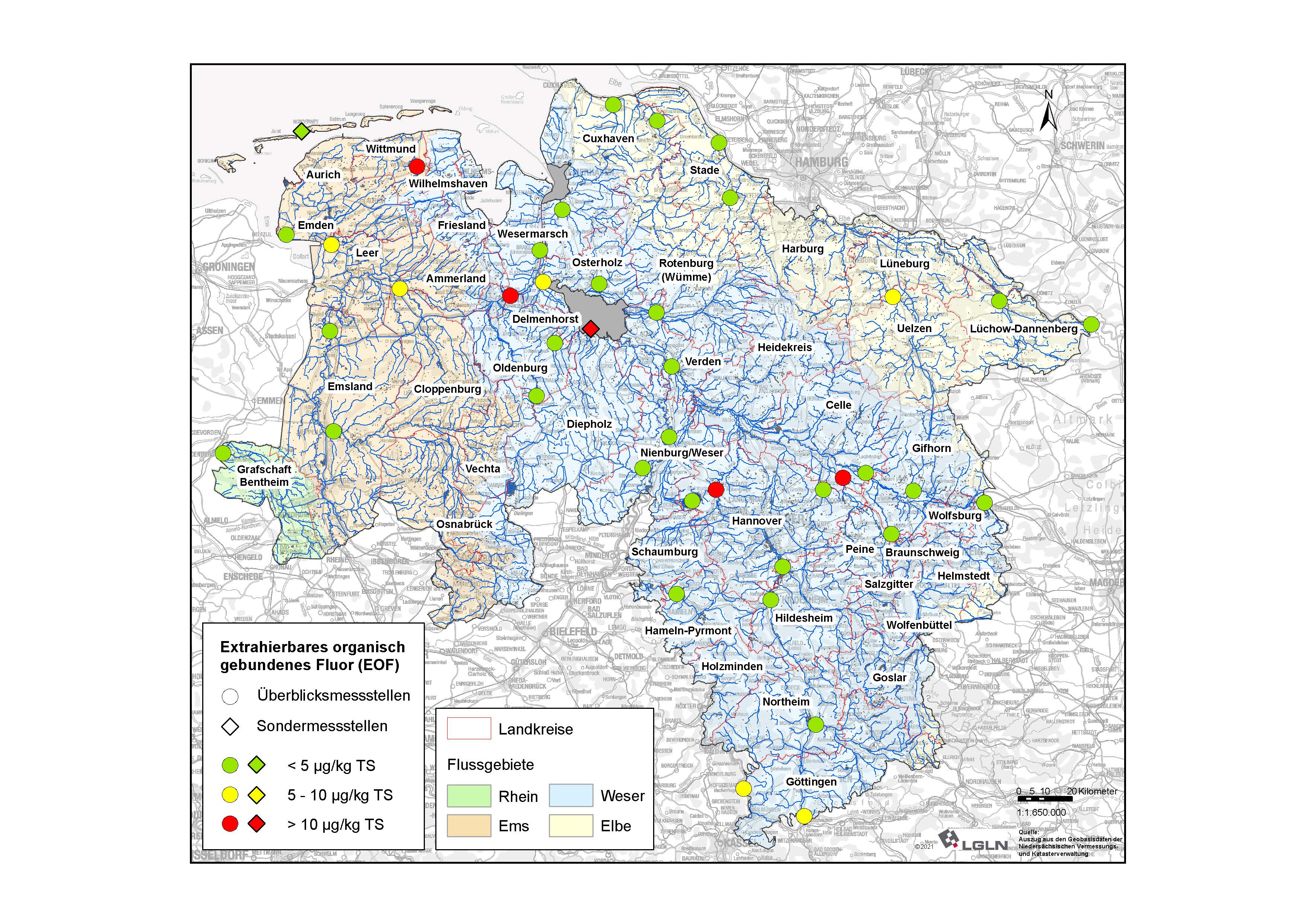 Die Ergebnisse der durchgeführten Monitoring-Studie bestätigten die erwartete, weitverbreitete (ubiquitäre) Belastung niedersächsischer Oberflächengewässer mit PFAS beziehungsweise weiteren fluorhaltigen organischen Stoffen. Durch die Bestimmung des EOF als Summenparameter konnten lokale Schwerpunkte mit fluorhaltiger organischer Belastung erkannt werden, die entweder bereits durch die herkömmliche Einzelstoffanalytik oder erst nach dem zusätzlichem TOP-Assay als PFAS-Belastungsschwerpunkte bestätigt werden konnten. Die höchsten Gehalte eines Einzelstoffes (PFOS) sowie der maximale EOF-Gehalt aller analysierten Proben wurden erwartungsgemäß im Sediment der Grollander Ochtum bestimmt. Diese wurde gezielt als Sondermessstelle mit bereits bekannter, hoher PFOS-Belastung ausgewählt, da sie im Zusammenhang mit früheren Feuerlöschübungen auf dem Bremer Flughafen steht. Weitere auffällige Belastungsschwerpunkte waren in den Flüssen Leine (Neustadt am Rübenberge), Fuhse (Wathlingen), Harle (Nenndorf), Hunte (Reithörne), Weser (Farge und Brake) und in der Ems (Gandersum) zu finden (Abb. 2, Abb. 3). Eine konkrete Quellenzuordnung war in den meisten Fällen, aufgrund der Gewässergröße und der Vielzahl möglicher Eintragspfade, jedoch nicht möglich.