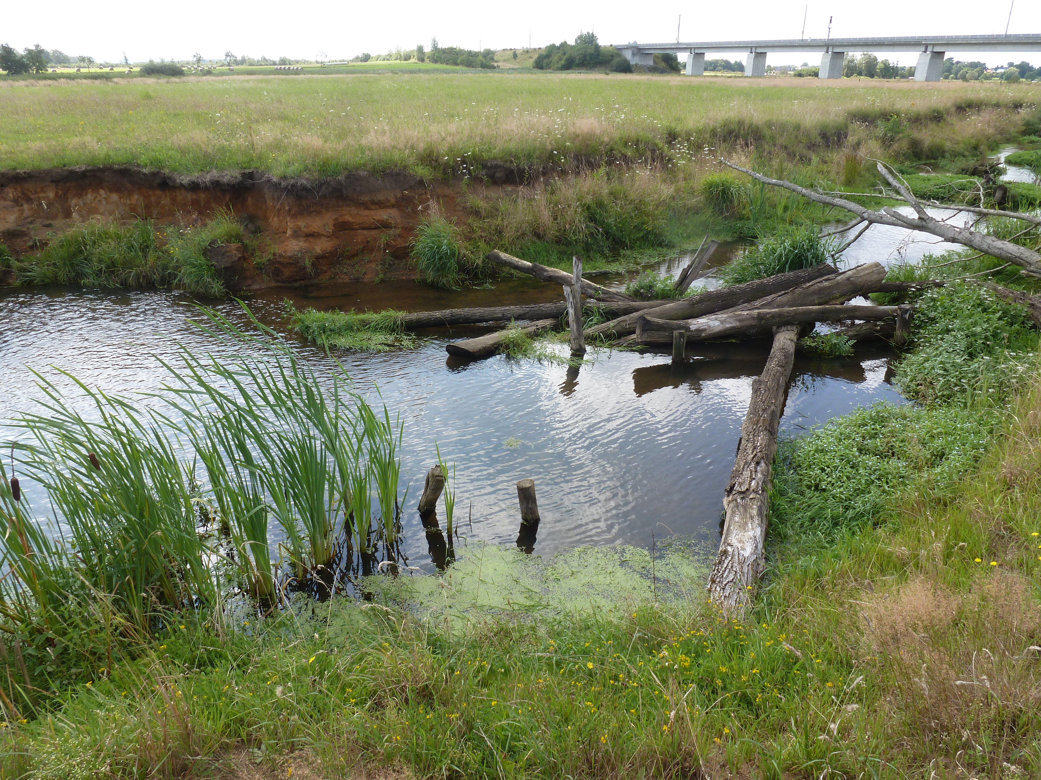 Exemplarisch werden die Monitoringergebnisse einer Entwicklungsmaßnahme am kleinen Fluss Schunter im süd-östlichen Niedersachsen vorgestellt: Die Schunter ist in weiten Teilen ein begradigter, ausgebauter, strukturarmer Tieflandfluss (s. Abb. 1) mit einer entsprechend artenarmen aquatischen Flora und Fauna. Im Jahre 2010/11 wurde in den Stemmwiesen im Landkreis Helmstedt ein rund zwei Kilometer langer Abschnitt mäandrierend in die ursprünglich tiefste Talsohle verlegt, mit variierenden Breiten und Tiefen gestaltet sowie mit Kies und Totholz angereichert (s. Abb. 2). Außerdem wurden in der Aue Stillwasserbereiche geschaffen und an die Schunter angebunden.