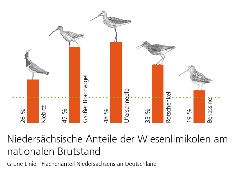 Niedersachsen gilt auch heute noch als „das Wiesenvogelland“ Deutschlands, in dem Arten wie Uferschnepfe, Kiebitz, Brachvogel, Rotschenkel oder Wachtelkönig zu hohen Anteilen am gesamtdeutschen Bestand brüten. Daraus resultiert gleichzeitig eine hohe Verantwortung für ihren Schutz, nicht nur in Niedersachen und Deutschland, sondern auch innerhalb Europas. Ganz besonders gilt dies für die Uferschnepfe. Deren westliche Population hat in Europa nur ein sehr kleines Verbreitungsgebiet: