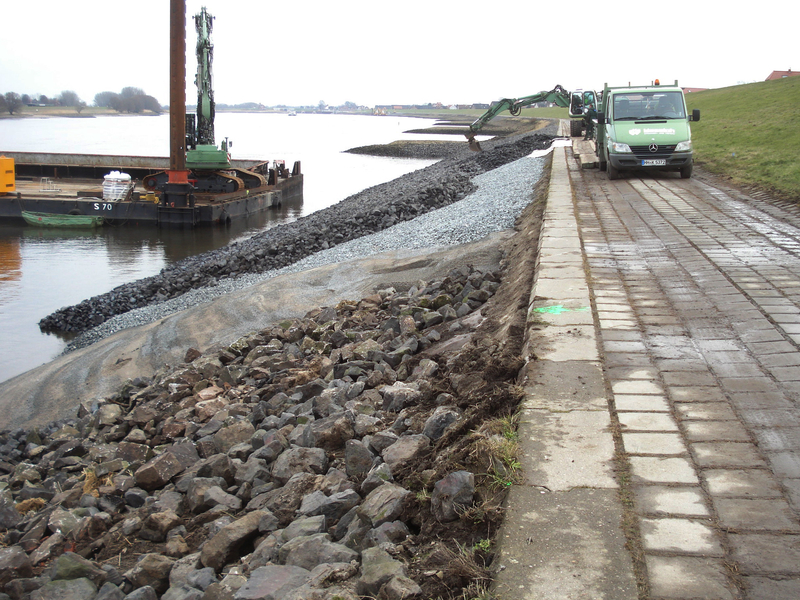 Es schützt den Deichfuß vor den Kräften des Wassers und braucht gerade deshalb selbst Pflege und Schutz: Über 6,5 Kilometer Deckwerke galt es entlang der Elbe in den vergangenen Jahren auf insgesamt 26 Kilometern Deichstrecke instand zu setzen. Die Bewältigung der Mammutaufgabe ist auch ein Beispiel für eine gute Zusammenarbeit der verschiedenen Institutionen der Wasserwirtschaft: Während sich an anderer Stelle gern über Zuständigkeiten oder Kompetenzen gestritten wird, haben sich die WSV, das Land Niedersachsen und die örtlich zuständigen Deichverbände zusammengetan und eine Vereinbarung über die Unterhaltung und Instandsetzung der Schüttsteindeckwerke an der Tideelbe getroffen. Der Erfolg gibt Ihnen recht: Das Großprojekt wird innerhalb des vorgegebenen Zeitrahmens fertig.