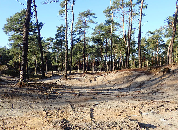 In der Nähe von Ehrhorn wies das Projektgebiet „Großer Sand“ vor der Maßnahmenumsetzung eine lichte Bestockung mit Kiefern auf. Ursprünglich war im Rahmen des IP LIFE-Projektes vorgesehen, auf der Fläche etwa 1,5 ha Binnendünen-Lebensraumtypen wiederherzustellen. Im Zuge der Planung der Maßnahme wurde deutlich, dass hier auch größer gedacht werden kann. Das Forstamt Sellhorn erklärte sich bereit, die Maßnahmenfläche zu vergrößern, sodass die weitere Auflichtung des Bestandes auf etwa 6 ha erfolgte. Dabei blieb die Fläche offiziell Wald. Im Sinne des Waldgesetzes gehören zum Wald auch Moore, Heiden, Gewässer und sonstige ungenutzte Ländereien, die mit Wald zusammenhängen.