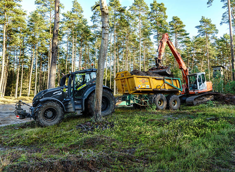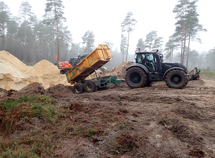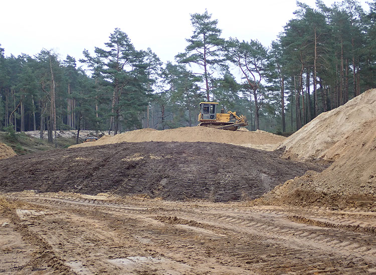Auf 6 ha Fläche fällt eine Menge abzutragendes Material an. Doch wohin damit? Das IP LIFE-Team beim NLWKN und das Forstamt Sellhorn strebten an, den abgetragenen Oberboden möglichst ortsnah wieder einzubringen, um klimaschädliche Transporte von hunderten LKW-Ladungen Bodenmaterial zu vermeiden. Der zuständige Landkreis Harburg genehmigte daher, im randlichen Bereich der Maßnahmenfläche den Oberboden in eine „sandüberdeckte Verwallung“ einzubauen. Die Baggerfahrer legten durch Ausbaggern von Sand eine Mulde an, in welche der gesamte Oberboden aus dem Gebiet eingebracht wurde. Abschließend deckten sie den Oberboden mit dem vorher entnommenen Sand wieder ab, sodass die Verwallung sich optisch ins Gelände einfügte. Auf diese Weise wurde nicht nur CO2, sondern auch noch Steuergeld gespart.