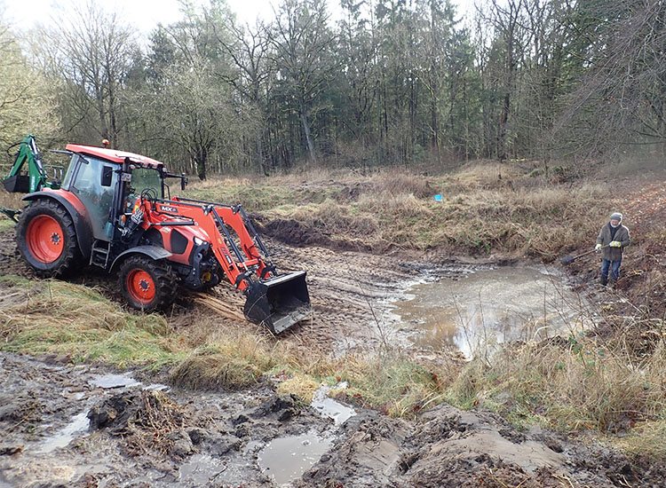 An einem anderen Wuchsort im Landkreis Celle (Gut Sunder, betreut vom NABU) konnte in Zusammenarbeit mit dem Teichwirt der benachbarten Meißendorfer Teiche innerhalb von wenigen Stunden ein unkomplizierter Reaktivierungsversuch für den seit Jahren abnehmenden und 2021 erstmals erloschenen Froschkrautbestand unternommen werden. Unter Anleitung der fachlichen Maßnahmenbegleitung befreite der Teichwirt den kleinen Teich mit Traktor und Baggerschaufel von Vegetation und Schlamm. Das Material konnte im nahen Umfeld des Gewässers abgelegt werden.