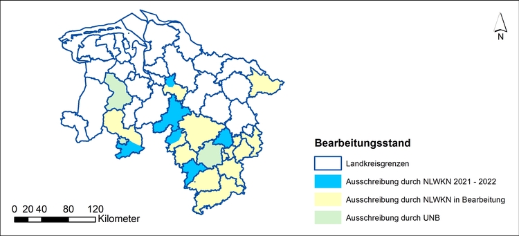 Da besonders wertvolle Grünlandbereiche vor allem in Südniedersachsen zu erwarten sind, werden die Kartierkulissen parallel zur Aktualisierung der landesweiten Biotopkartierung von Südost nach Nordwest erstellt.