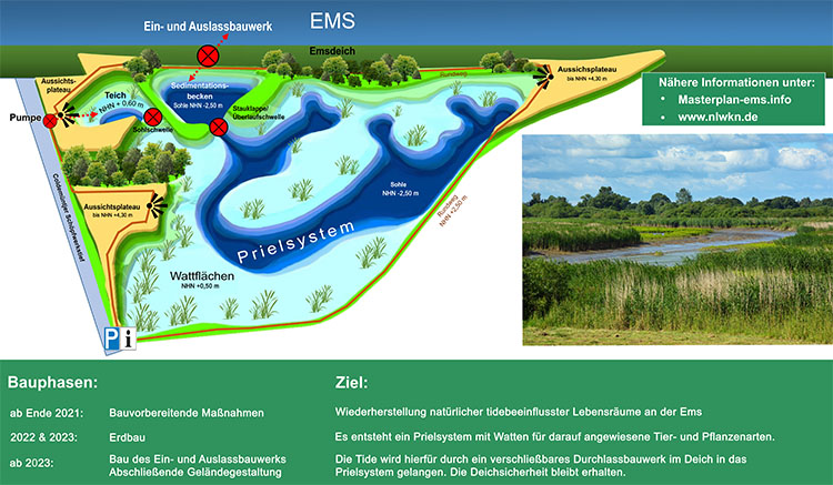 Als ein Ziel des Masterplans Ems 2050 sollen verlorengegangene, natürliche Lebensräume im Seitenbereich der Unterems geschaffen bzw. wiederhergestellt werden. In Verbindung mit der noch erheblich zu verbessernden Gewässergüte durch die Tidesteuerung soll wieder ein ökologisch lebendiger Fluss entstehen.