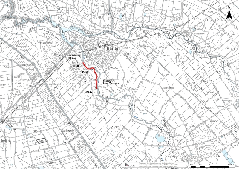 Lageplan: Der Verlauf der Deicherhöhung und der Deichrückverlegung auf dem Lageplan: Der betroffene Deichabschnitt reicht von der Mühlenwegbrücke bei Deich-km 1+610 bis zum Schöpfwerk „Loher Westmark“ bei Station 3+620.   Bildrechte: NLWKN/LGLN