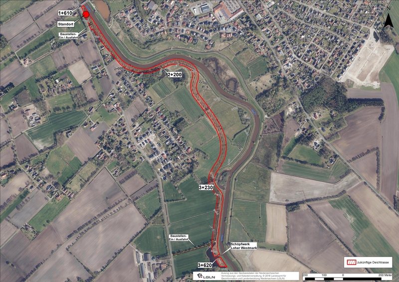 Lageplan: Der Verlauf der Deicherhöhung und der Deichrückverlegung auf dem Lageplan: Der betroffene Deichabschnitt reicht von der Mühlenwegbrücke bei Deich-km 1+610 bis zum Schöpfwerk „Loher Westmark“ bei Station 3+620.