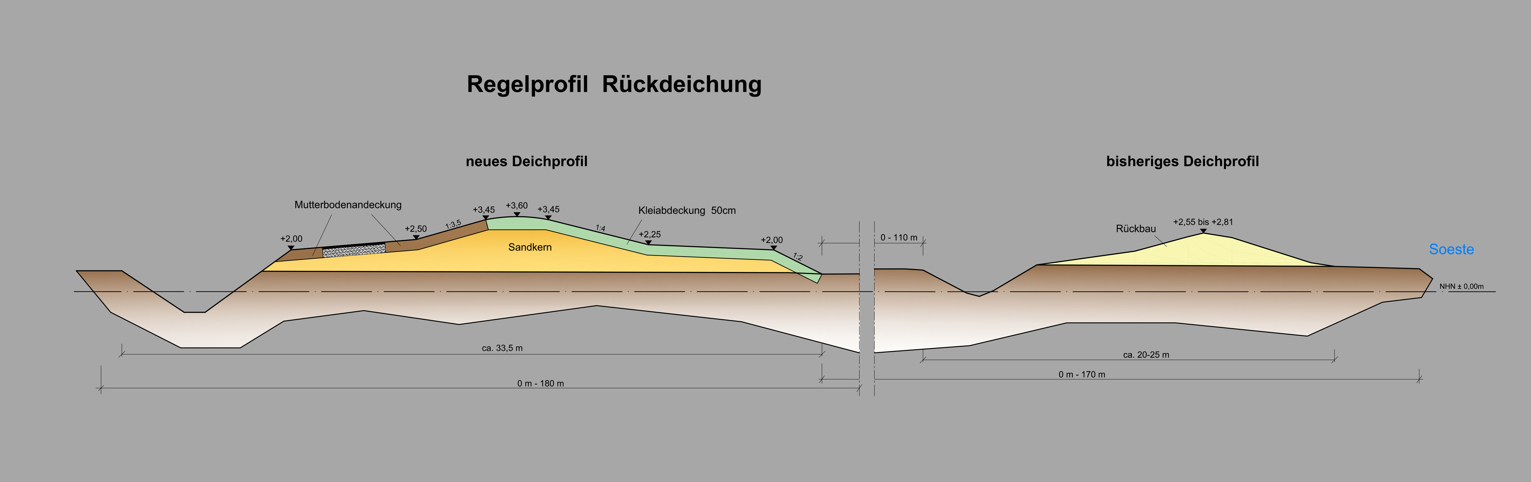 Regelprofil: Im sogenannten Regelprofil, einer schematischen Darstellung der Deichrückverlegung, werden die Änderungen gegenüber dem bestehenden Deichprofil sichtbar.