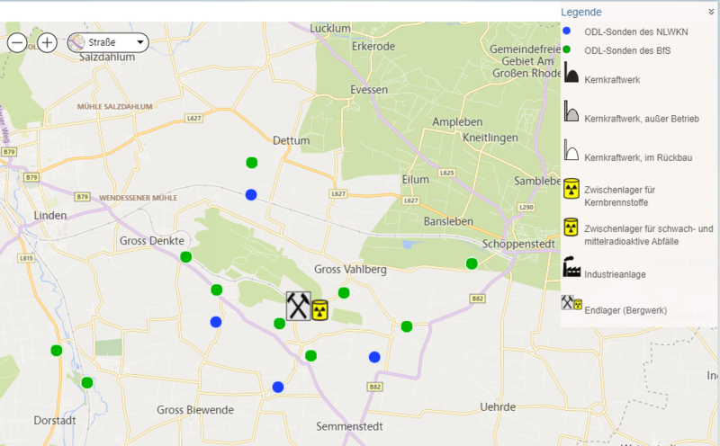 ODL-Messsonden um die Schachtanlage Asse II. Zu den neuen NLWKN-Sonden (blaue Punkte) im Umland werden zukünftig drei weitere Sonden direkt auf dem Betriebsgelände verteilt.