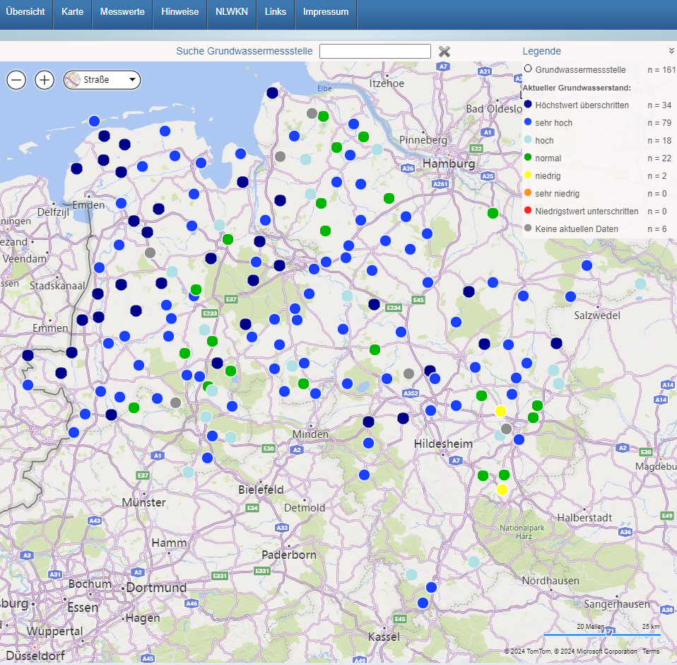 Grundwasserstandonline visualisiert tagesaktuelle Grundwasserstandsdaten sowie langjährige Datenreihen anschaulich per Kartenansicht, interaktiver Ganglinien und Tabellen. Ergänzt wird das Angebot durch messstellenspezifische Stammdaten mit Angaben zu den hydrogeologischen Verhältnissen. Die Datengrundlage bilden die Grundwassermessstellen des 2022 entwickelten landesweiten Messprogramms „Klima-Grundwasserstand“. Für die Webdarstellung wurden diese 161 repräsentativen Messstellen in den verschiedenen Regionen Niedersachsens mit einer aufwändigen Datenfernübertragungstechnik versehen.