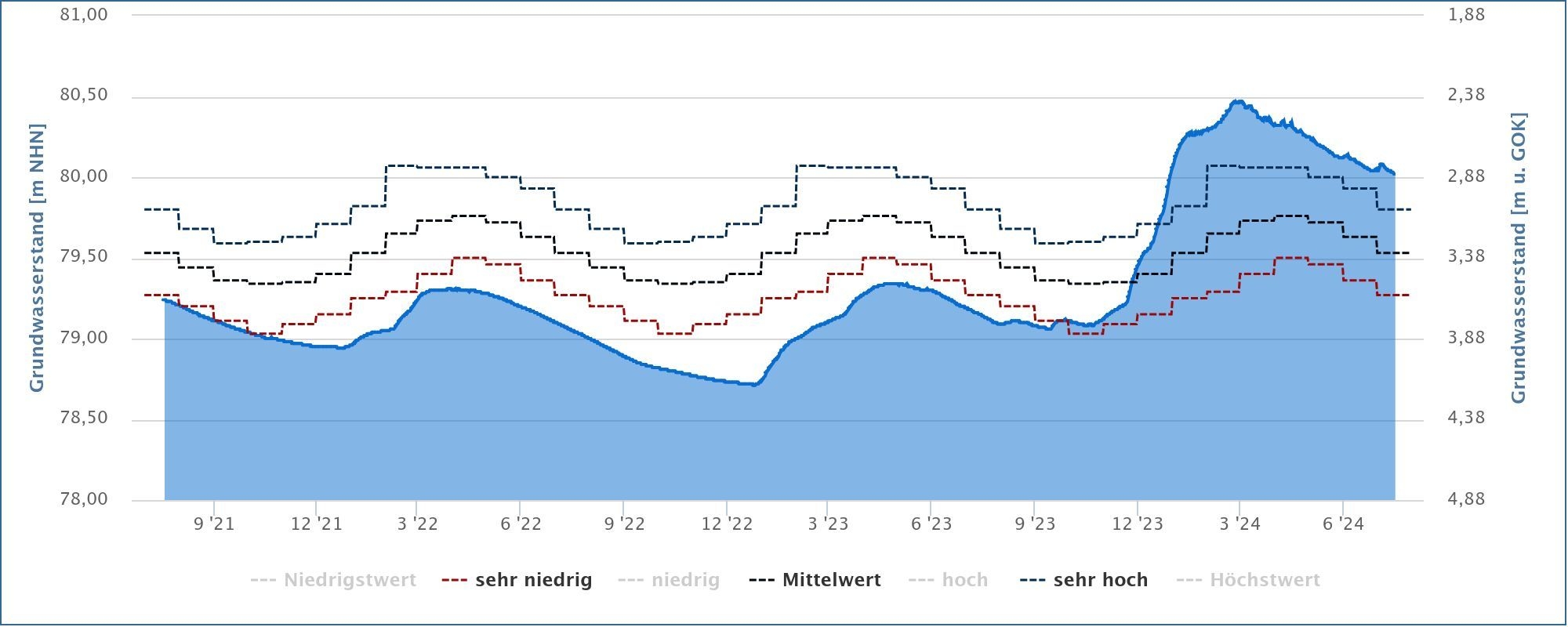 Exemplarischer Verlauf einer Grundwasserganglinie mit ausgeprägtem Jahresgang im Lockergestein in Form von Tageswerten (September 2021 bis Juli 2024).Zur Einordnung die langjährige Dynamik können die Grenzen der Klassifikation eingeblendet werden.