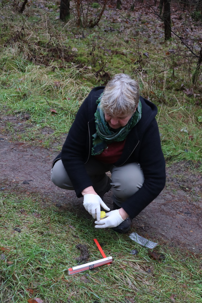 Die Wolfsberaterin Ulrike Kruse beim Sammeln von Losungsproben, um das Niedersächsische Wolfsmonitoring zu unterstützen.