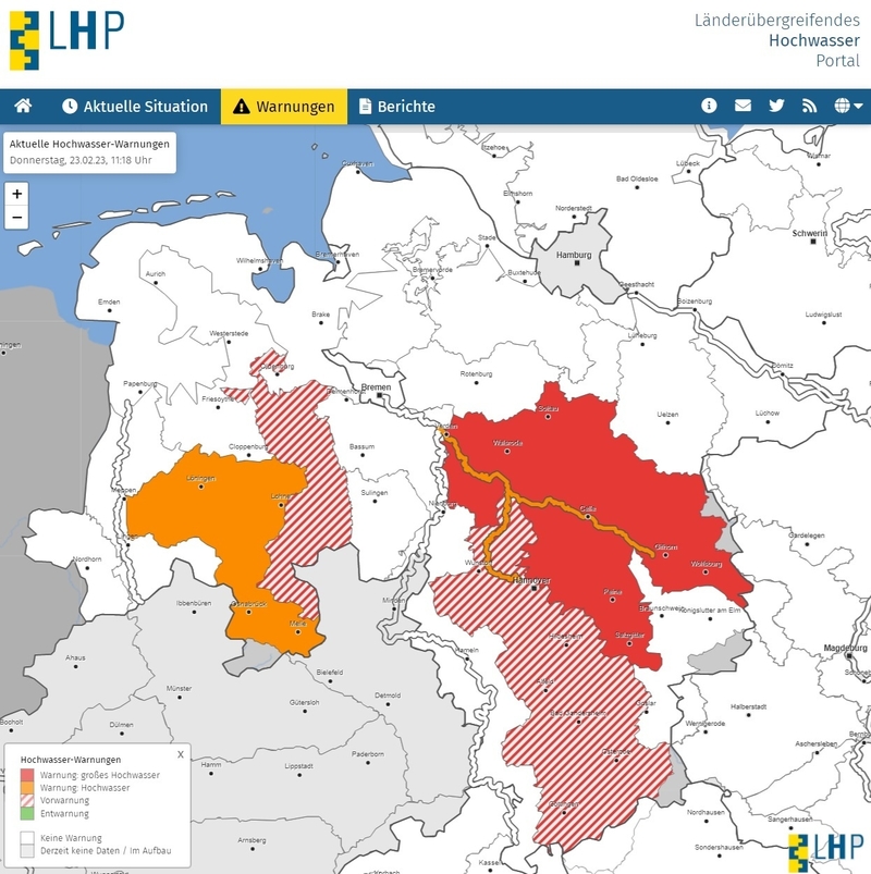 Das länderübergreifende Hochwasserportal (LHP) bietet unter anderem flussgebietsbezogene Warnungen und verschiedene Warnklassen.   Bildrechte: NLWKN