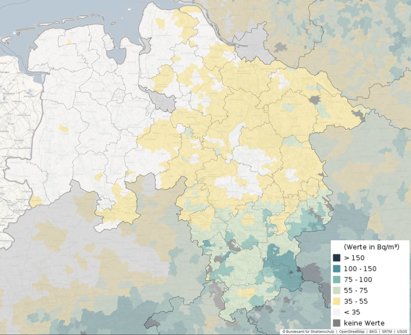 Schätzung der durchschnittlichen Radon-Aktivitätskonzentration der Raumluft für das Land Niedersachsen (Quelle: Bundesamt für Strahlenschutz). Deutlich zu erkennen ist ein Anstieg der prognostizierten Werte von Nordwesten nach Südosten.