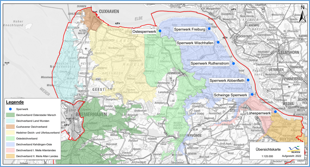 Einen Ersatzneubau hatte der NLWKN 2022 in Otterndorf fertigstellt: die neue Hadelner Kanalschleuse als Multifunktionsbauwerk. Die Ertüchtigung eines bestehenden Sperrwerks setzt der NLWKN derzeit mit dem Ilmenausperrwerk im Winsener Ortsteil Hoopte um. Bis auf das Ostesperrwerk, das sich im Eigentum des Bundes befindet, werden die betroffenen Sperrwerke allesamt vom NLWKN für das Land Niedersachsen betrieben und unterhalten.
