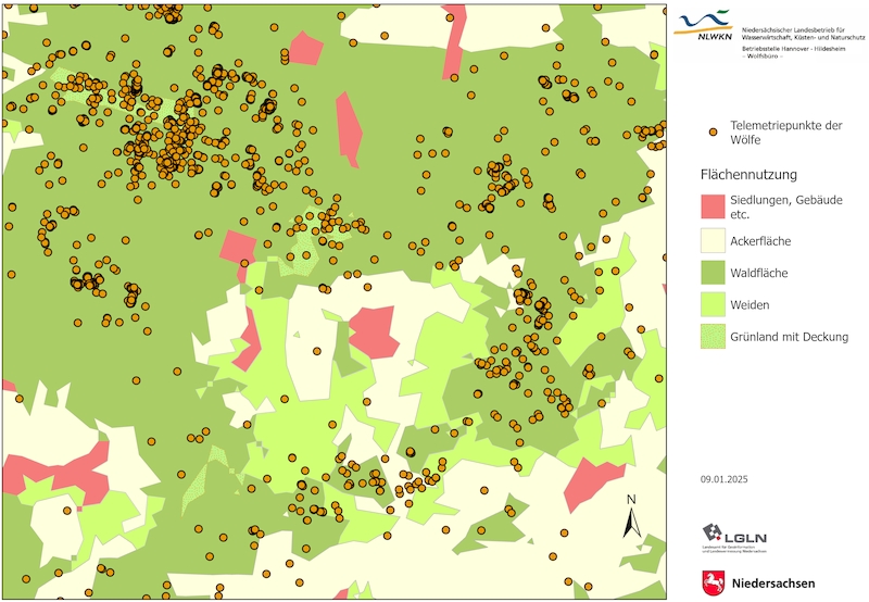 Im Rahmen der Studie wird die Habitatnutzung – also die Nutzung der verschiedenen Lebensräume wie Wälder, landwirtschaftlich genutzte Flächen, aber auch Ortschaften – untersucht. Hierbei werden für jeden Telemetriepunkt die Art der Landnutzung (Kategorien Siedlungen, Ackerland, Wald, Weiden, Grünland mit Deckung, vegetationsfreie Gebiete und Wasserflächen) und zusätzlich ein sogenannter HumanFootprint zugeordnet, wobei der HumanFootprint eine Aussage darüber trifft, wie häufig sich an diesem Punkt Menschen aufhalten. So können Zusammenhänge zwischen der Art der Lebensräume und der Präsenz von Menschen auf der einen Seite und den bevorzugten Aufenthaltsorten der Wölfe auf der anderen Seite ermittelt werden. Diese Analyse liefert wichtige Hinweise darauf, wie sich die Tiere in verschiedenen Landschaftsstrukturen bewegen und welche Faktoren ihre Raumnutzung am stärksten beeinflussen. Dies ermöglicht ggf. einen besseren Umgang mit Wolf-Mensch-Begegnungen.