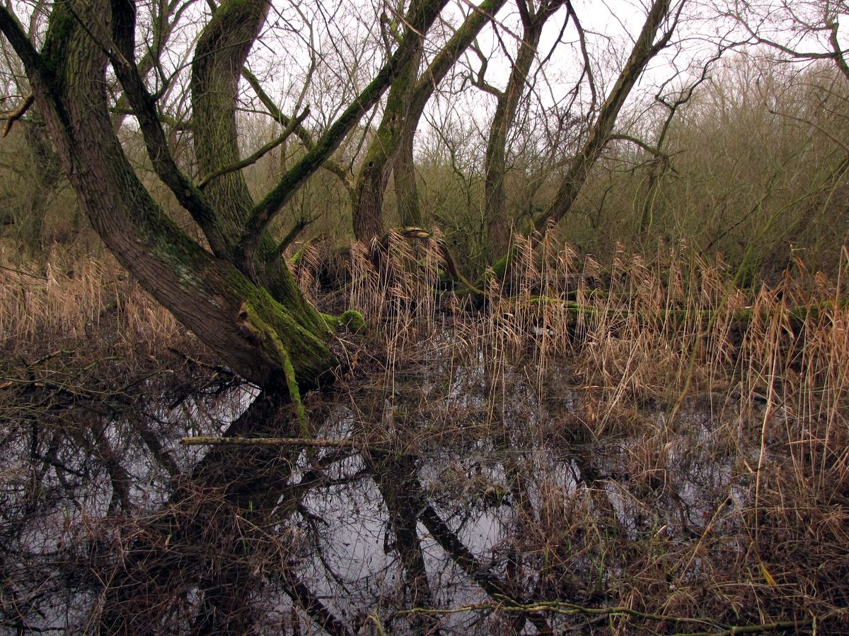 Sumpfiger Weiden-Auwald mit Schilf am Rand eines Baggersees an der Alten Leine bei Hannover-Wülfel; 1.2016; WWS.3 [FFH 91E0]