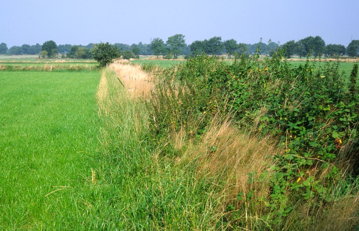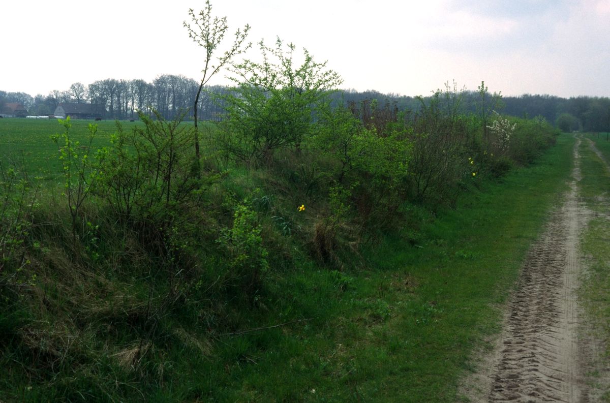 Überwiegend gehölzfreie Abschnitte eines Wallheckensystems (im Hintergrund Wallhecken mit Baumreihen); Ostfriesische Geest bei Bagband; A9.99; HWO