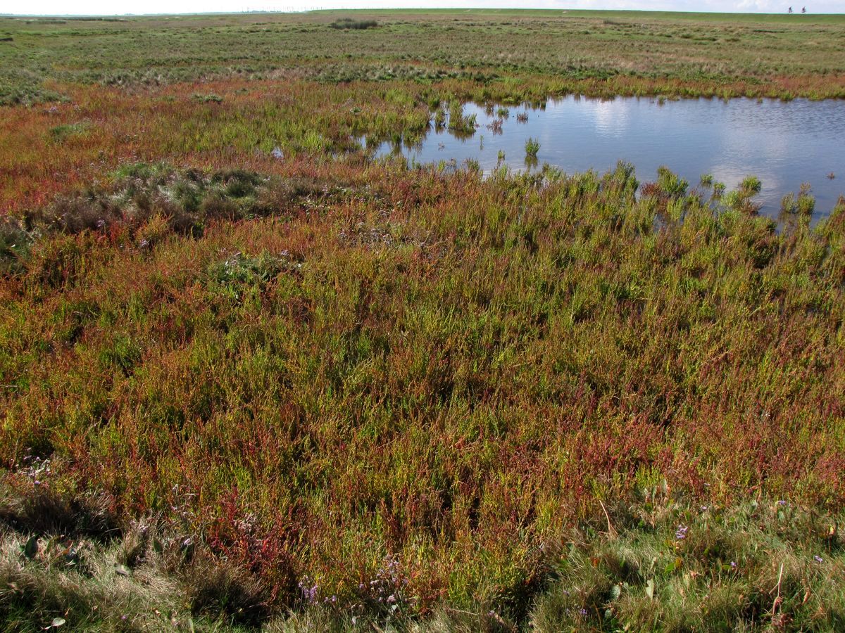 Vorland-Quellerflur (Salicornietum ramosissimae) mit Tümpel in einer Salzwiese; Ostplate von Norderney; M9.2014; KWQV.s/KLZ [FFH 1310]