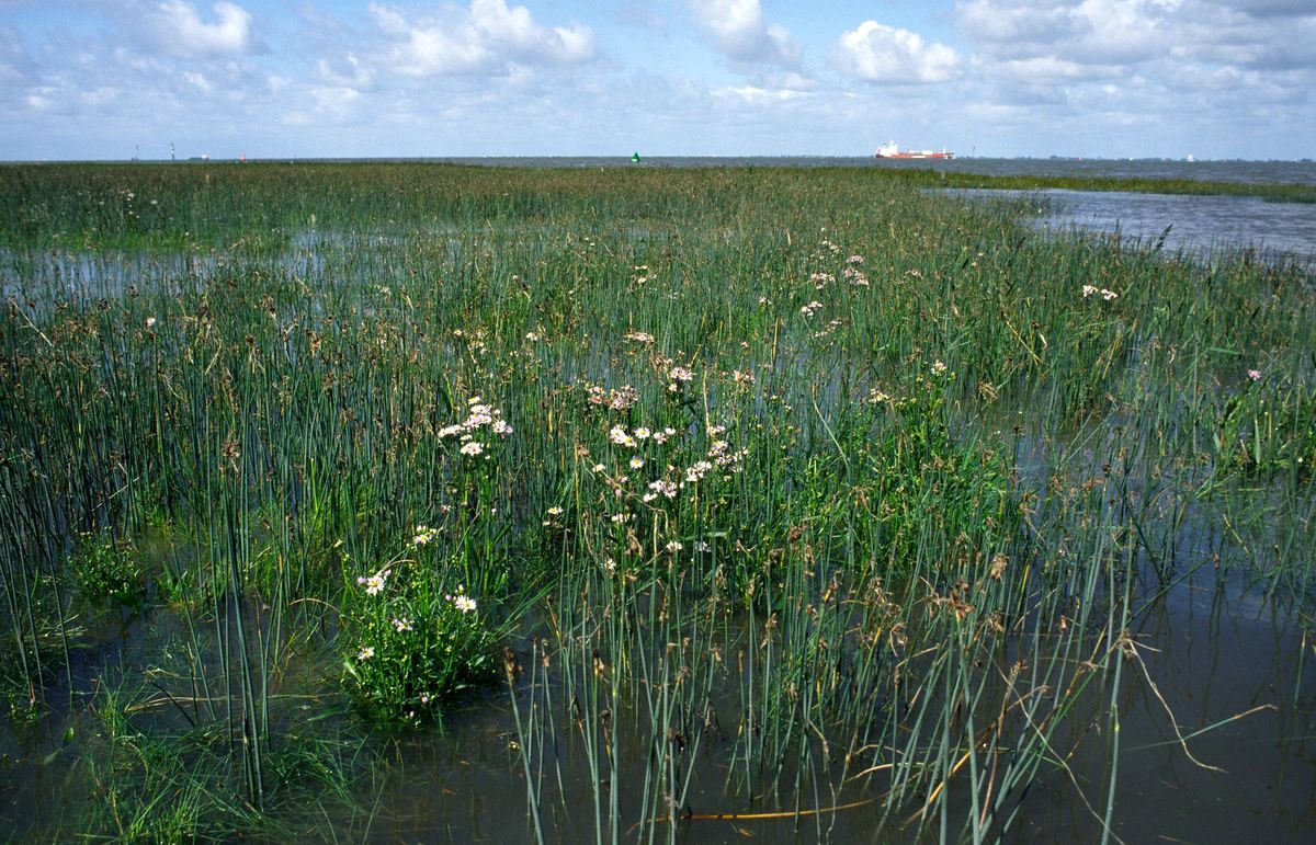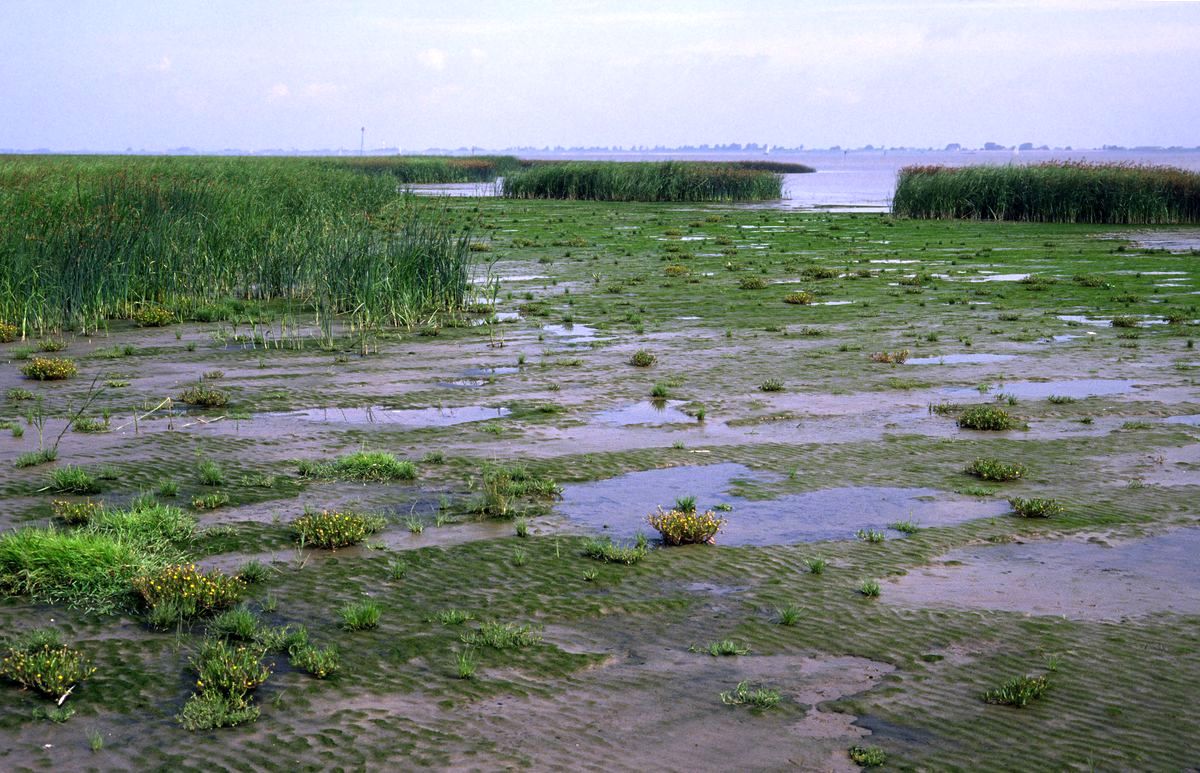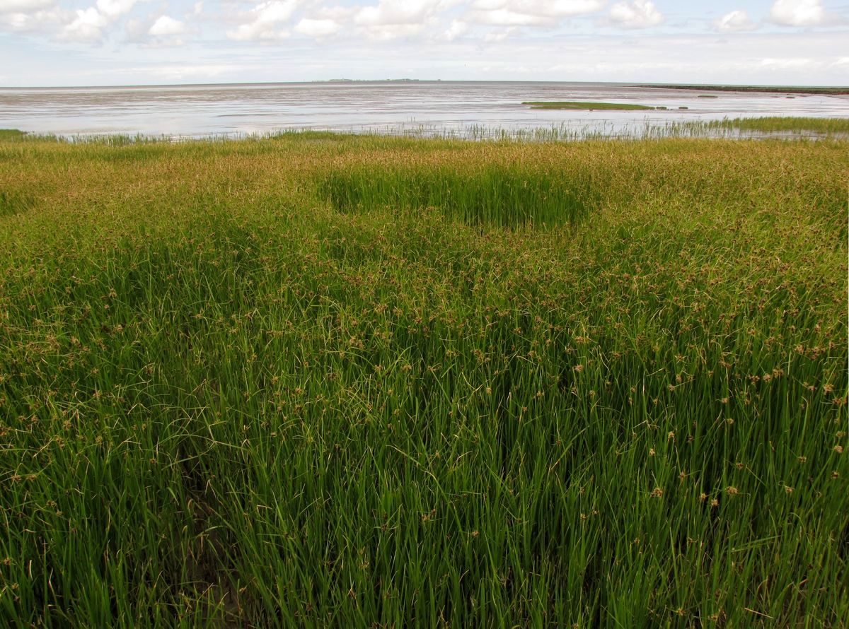 Sandiges Brackwasserwatt mit Röhricht aus Salz-Teichsimse und Strand-Aster; Elbe-Ästuar nahe der Ostemündung; E7.1993; KWRT.s [FFH 1130]