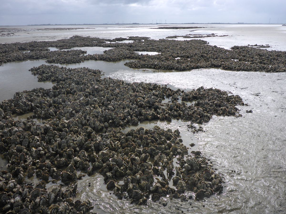 Bank der Pazifischen Auster im Eulitoral. Hohe Weg Watt zwischen Weser- und Jademündung am Priel Kaiserbalje; M4.2020; [FFH 1140]