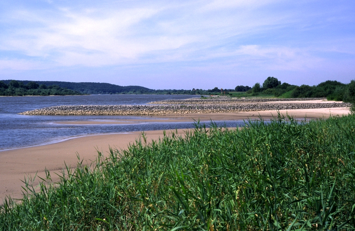 Tieflandfluss mit neuen Buhnen neben naturnahen Uferstrukturen (vegetationsarme Sand- und Schlammbänke [tlw. Pioniervegetation, im Bild nicht sichtbar], Schilfröhricht); Mittelelbe östl. Viehle; M8.95; FVS.b / FP / NRS [insgesamt FFH 3270]
