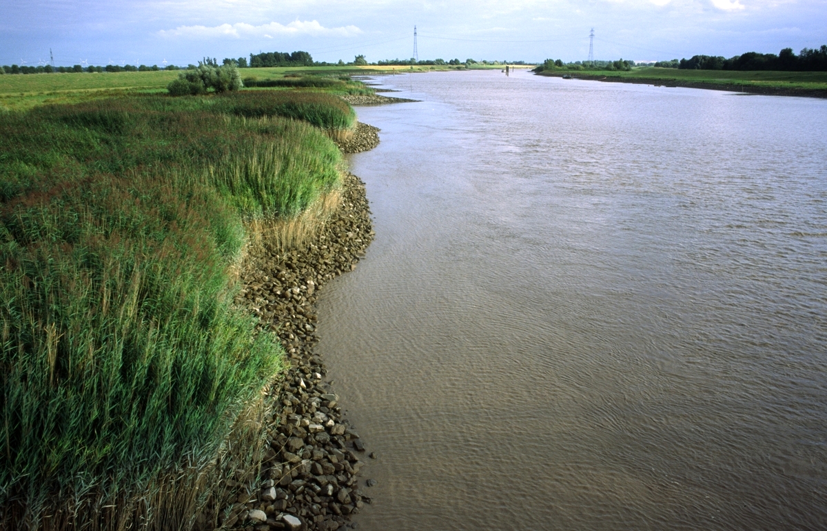 Flussabschnitt im Süßwasser-Tidebereich mit Uferbefestigung aus Steinschüttungen sowie Schilfröhrichten (am Ufer oberhalb MThw); Unterems bei Weener; M8.99; FVT/ NRS