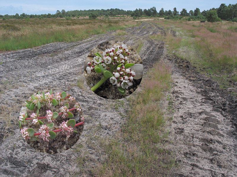 Sandige, wechselfeuchte Panzerspur in einer Sandheide mit Vorkommen von Hirschsprung (Corrigiola litoralis, Mitte) und Knorpelkraut (Illecebrum verticillatum, links); Truppenübungsplatz Bergen-Hohne; A7.07; NPA; Fotos und Kollage: O. v. Drachenfels