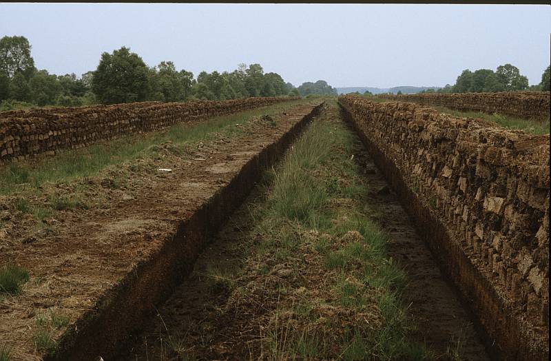 Torfstichfläche mit aufgeschichteten Torfstücken und Resten eine Pfeifengras-Stadiums; Aschener Moor bei Vechta; 8.82; DTS; Foto: O. v. Drachenfels
